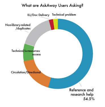 The ability to add useful descriptive codes from our own, customized list at the end of a session is still fairly new to AskAway; late 2011 is when QuestionPoint introduced the improvements to this feature. The descriptive codes help us to see how students use AskAway; since we have begun to use the codes more extensively in 2011, we can see that the majority of questions are related to research - a great result! Ready Reference questions generally follow research, ahead of circulation, directional, e-resources access, technical, and other question types. See chart for details.[[{"type":"media","view_mode":"media_large","fid":"512","attributes":{"class":"media-image size-full wp-image-1581 alignleft","typeof":"foaf:Image","style":"","width":"370","height":"377","title":"Whataretheyasking","alt":""}}]]