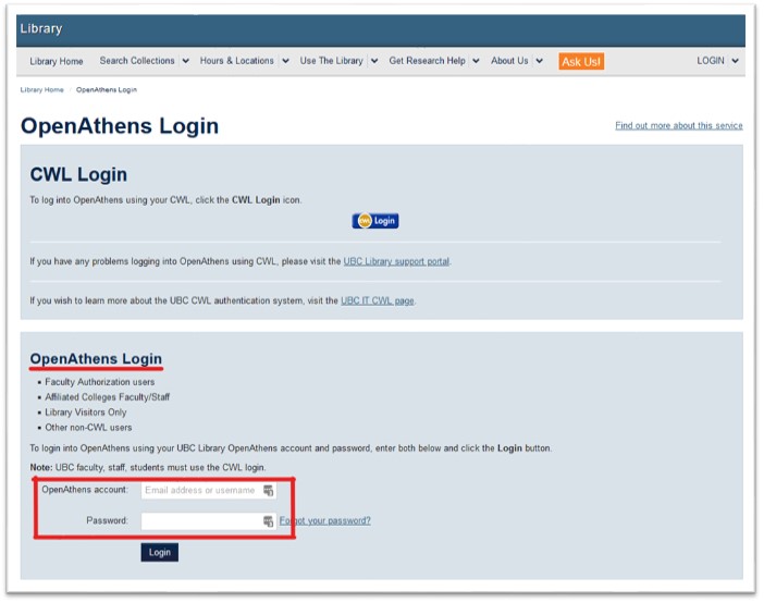 - To access UBC’s eResources, AskAway service providers MUST FIRST sign in using this link: OpenAthens (OpenAthens Login at bottom, not CWL Login). Once logged in, you will be directed to the UBC Library website and will have access for 8 hours, or until you exit the browser.