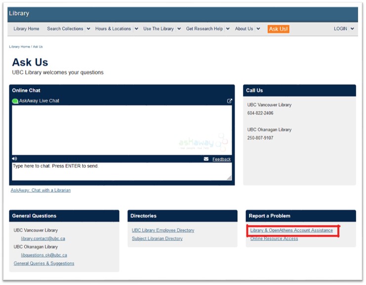 For further queries, please direct your patron to UBC’s Ask Us page: https://ask.library.ubc.ca/. The inquiry form specific to OpenAthens problems is found in the Report a Problem section.